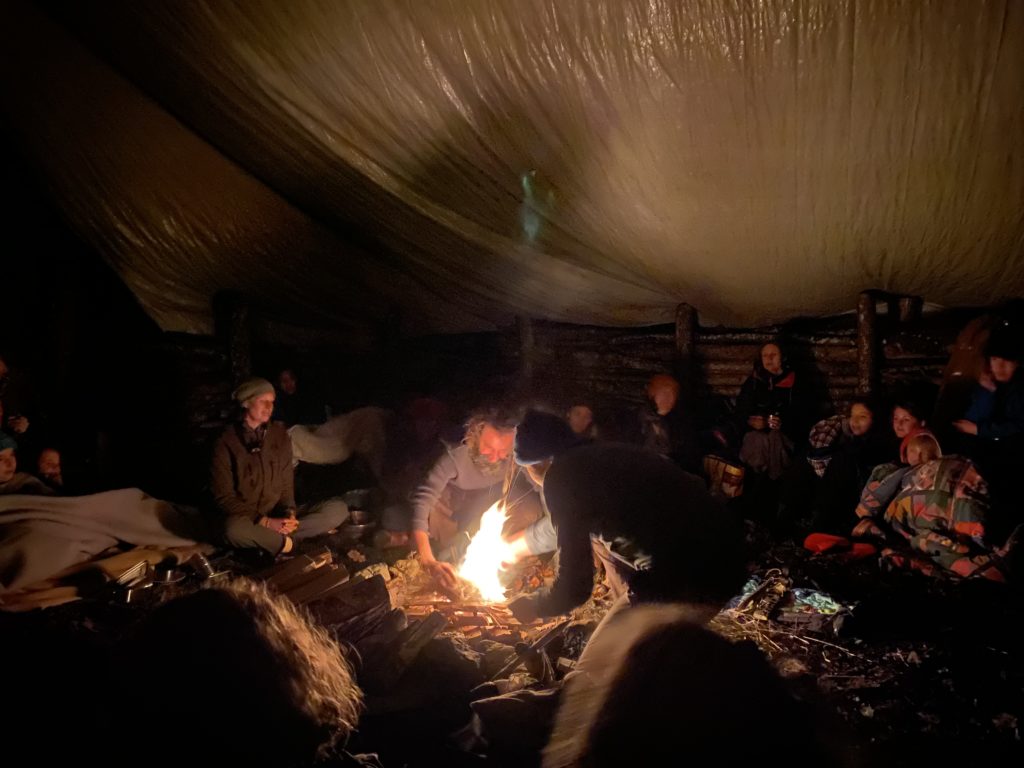 Le 15 novembre 2025, près de 40 personnes, ami·es, familles et participant·es à nos activitése se sont réuni·es au canapé forestier pour un Festin des Ancêtres. Le vent et la pluie battante nous ont offert la chance de nous resserrer, profiter encore plus la chaleur humaine et la joie de danser avec les éléments. Ensemble, on a chanté, papoté, et surtout, nous avons honoré nos lignées en écoutant l’histoire de chaque ancêtre invité au festin. Jusque tard dans la nuit, nos coeurs et nos papilles se sont délectés de ces plats cuisinés avec tant d’émotion, d’amour et de confiance, par chaque convive, avec les soutien précieux et palpable des ancêtres.